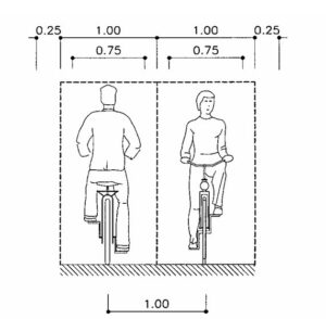 • Ancho suficiente para permitir cruces: Al transitar por los CMI diferentes tipos de usuarios, que circulan a distintas velocidades y presentan diferentes niveles de equilibrios, se debe en todo momento asegurar que los cruces y adelantamientos sean seguros, permitiendo mantener distancias de seguridad adecuadas. Siempre se confía en un comportamiento racional de los usuarios para este tipo de maniobras, teniendo en cuenta la fragilidad del usuario, reduciendo velocidades, siendo respetuosos y responsables. Aún así se debe asegurar un gálibo mínimo que permita esta seguridad. Por tanto, basándonos en los criterios descritos por la DGT en su “Manual de recomendaciones de diseño, construcción, infraestructura, señalización, balizamiento, conservación y mantenimiento del carril bici.” (2000) un CMI ha de tener un gálibo mínimo, en la medida de lo posible, de 2’50 metros. Este viene dado por los 0’75 metros que se le calculan de ancho a cada usuario (en bicicleta), por lo que se establece un carril seguro de 1 metro de ancho,  se le añaden 0’25 metros a cada lado de margen de seguridad. En tramos donde no se pueden respetar estas medidas mínimas deberá venir señalizado para que los usuarios presten especial atención a la hora de cruzarse.